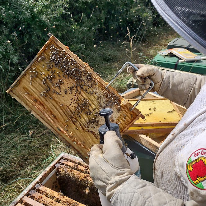 Appliceras genom finfördelad sprayning på bin och yngel på ramarnas yta med hjälp av manuell spruta.